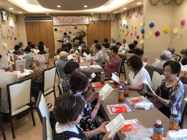 歌集を手に懐かしの曲を皆で歌う一体感は、カラオケとはまた別の楽しさ。一緒の曲を歌うことで心が繋がるのを感じます。